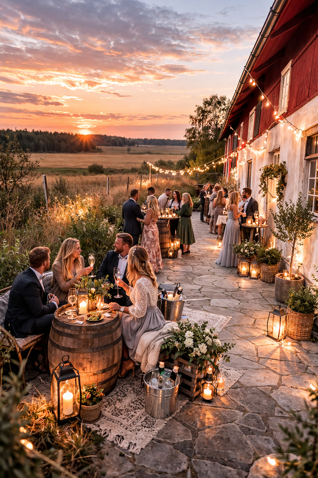 När kvällsljuset faller genom ladugårdens stora portar och ljusslingor tänds i takbjälkarna uppstår en varm och intim atmosfär som gör varje ögonblick minnesvärt.